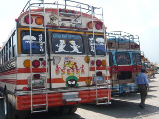左から2枚はメキシコとグアテマラの国境。国境越えは非常に簡単。右端はなぜか外国人旅行者に「チキンバス」と呼ばれているローカルバス。チキンバスはしばしば車内に武装強盗が現れるので(今はどうか分かりませんが)利用はお薦めできません。現地の旅行会社などが運行しているシャトル(相乗りのミニバン)移動が一番安全。治安の悪い国では「リスクは可能な限り減らす。安全に金を惜しんではならない」は鉄則。勿論「自分はチキンバスを使って移動したし、危険なんて全然感じなかった」という旅行者もいるでしょうが、たまたま被害に遭わなかっただけと考えた方が良いです。金を奪われるくらいならまだしも、命を奪われてはお終いなのです。