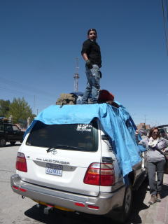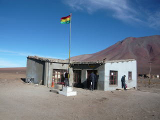4WDの同乗者は全員がウユニへ戻るので、僕だけ国境の少し手前にある露天風呂から別の車に乗り換えて国境へ向かいました(ドライバーがガソリンを節約したかった為)。写真中央はボリビアとチリの国境。でも、ここにチリのイミグレーションは無く、50キロ離れたサンペドロ・デ・アタカマの街外れにあります。国境からの車輛は必ず立ち寄ることになっていますので、チリの入国スタンプのもらい忘れ等の心配はありません。