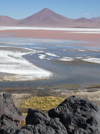 大抵の日本人旅行者はウユニ塩湖の上でジャンプして写真を撮るだけで帰ってしまいますが、もったいないですよね(そのような写真を撮りたいだけなのなら、別にウユニへ行かなくても世界中に同じような場所がたくさんあります)。なぜもったいないかと言うと、このエリアのハイライトはチリとの国境までの間に次々と現れる絶景だからです。写真右端は一見平地のように見えますが、周囲に植物が一切見当たらないことからも分かるように標高5千メートルを超えている場所。4WDに同乗していたドイツ人とフランス人たち5名は全員ダウンして無口になってしまい、元気に走り回っていたのは僕とドライバーだけでしたね(笑)。