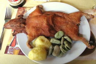 リマからナスカまで南下しました。ナスカでは小型機に乗って地上絵を見学するのが定番観光。人数が多いと10人以上を乗せることができる中型機利用になる場合もあります。また、天気が悪い時は地上絵が見えないので飛びません。上空から見た地上絵の感想は「うーん…」って感じですかね(笑)。右はペルーの名物料理であるクイ(cuy)、食用のモルモットです(汗)。料理法はまるごと素揚げにするか炭火焼き。お味の方はと言いますと、スパイスで臭みは消してはあるものの、こちらも「うーん…」って感じ(笑)。とは言え、ペルー料理は全体的には何を食べても美味しく、日本人の口にも合います。