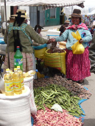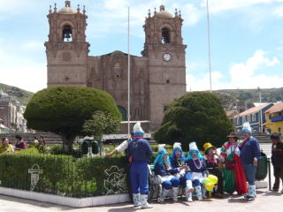 クスコからバスに乗り、アレキパ経由でプーノへ向かいました。アレキパに1泊したかったんですが、数日前に降ったという豪雨の影響でまだ街のそこら中が水浸しだったので(写真左端)、アレキパをスキップしてそのままプーノへ。プーノはチチカカ湖観光の拠点となる街で、ここまで来ると人々の服装もボリビア風に変わってきます。