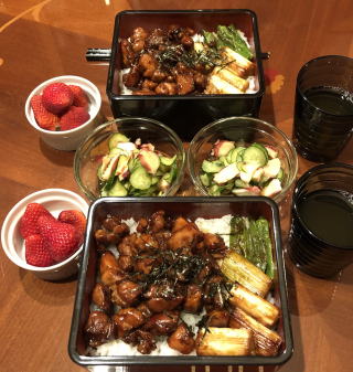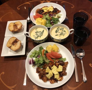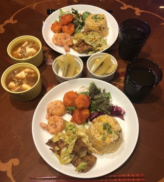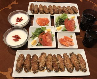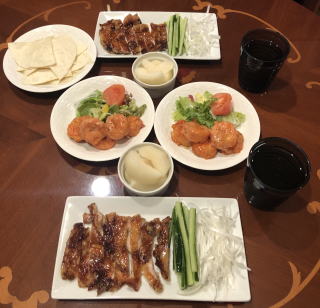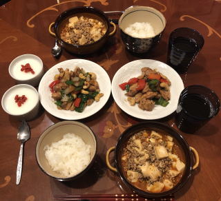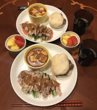 中華料理も我が家の定番メニュー。写真は順番に麻婆豆腐と酢豚、ニセ北京ダックと海老マヨ、回鍋肉と炒飯、棒棒鶏、ルーロー飯、冷麺。中でも我が家の自慢料理はニセ北京ダック!鶏のモモ肉を料理する際に皮を剥いで取っておき(皮だけでなく薄く身がついたまま残るように包丁で削ぎ落とすのがコツ、冷凍可能)、オーブンで焼き上げます。最後に水飴を塗って二度焼きすれば、飴色に輝くニセ北京ダックの出来上がり!包む皮は市販のトルティージャで代用(食べる前に電子レンジで温めて柔らかくします)。トルティージャに甜面醤を塗り、白髪ネギとキュウリを共に巻いて食べれば至福の瞬間が訪れます。