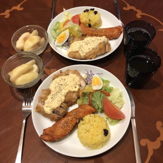 チキンのモモ肉はちょっと高いですが、手羽先や手羽元、ササミは安いので庶民の強い味方。写真は順番にロースト・チキン、手羽先のピリ辛味、チキン南蛮、鶏肉のカシュナッツ炒め、焼き鳥丼、親子丼です。もちろん、唐揚げや照り焼きチキンなんかも良く作ります。ロースト・チキンは骨付きモモ肉をニンニクの欠片と醤油、酒と一緒にビニール袋に入れて一晩漬け込んでおき、あとはオーブンで焼くだけ。簡単でとても美味しいです。ですが、我が家での一番人気は手羽先のピリ辛味。フライパンで手羽先を素揚げし、赤とうがらしの辛みをきかせた自家製照り焼きソースにからめてできあがり。10本なんてペロリといけます。