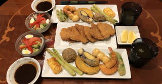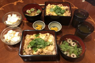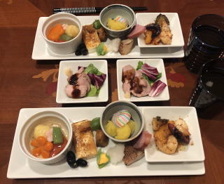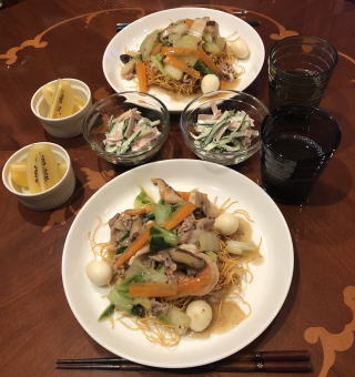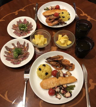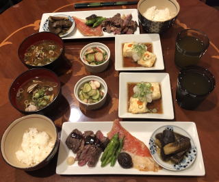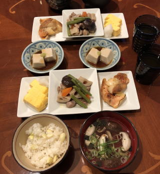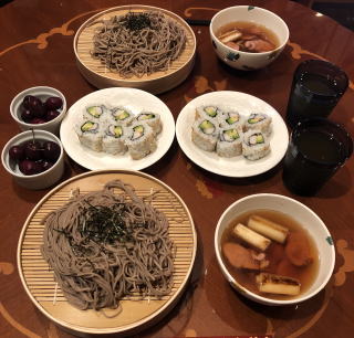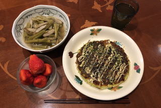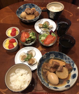 今や世界に冠たる日本食。寿司なんて外国人には大人気ですが、僕が若い頃は、日本では魚を刺身で食べる(生で食べる)なんてことを海外で話すと、露骨に「気持ち悪い」という顔をされたものです(笑)。ほんと、時代は変わりました。写真は順番に、かやく御飯、筑前煮、すき焼き、かにすき、牛のタタキ、お好み焼き、串カツセット、鴨せいろとカリフォルニアロール、皿うどんです。すき焼きの時は最後に冷凍うどんを入れて、すき焼きうどん、鍋の時はご飯を入れて雑炊を必ず作って食べます。旨い出汁を吸ったうどんや雑炊は最高の味!あと、僕も嫁さんも大阪人なので、お好み焼きは絶対に手作り。お店のような鉄板は無いですから、焼くのはフライパンを利用し、山芋を混ぜてふわふわにするのが我が家のお好み焼き、嫁さんの大好物です。