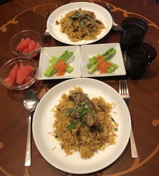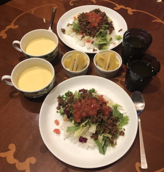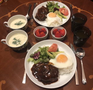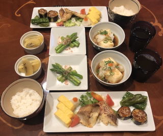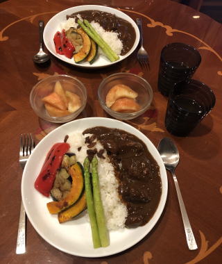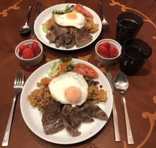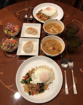 スパイスをきかせたエスニック料理も我が家では良く食べます。写真は順番にインドカレーセット(タンドリーチキン付き)、タイ料理セット(メインはガイ・ヤーン)、イズミール・キョフテ(トルコ料理)、メキシカン・ピラフ、タコ・ライス、ロコモコ、ビリヤニ、ビーフカレー、ガパオ・ライス(タイ料理)。ビーフカレーは市販のルーを使いますが、牛肉は圧力鍋で赤ワイン煮込みにし、仕上げ時に追加のスパイスとヨーグルトを少々混ぜます。最近は牛肉が高いので豚のスペアリブを使っていますが、黙っていれば豚肉と気付かないし(笑)すごく美味しいです。鶏肉をココナッツ・ミルクで煮込んで作るチキンカレーもお薦め。