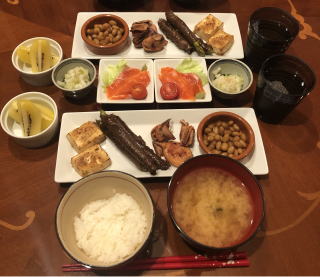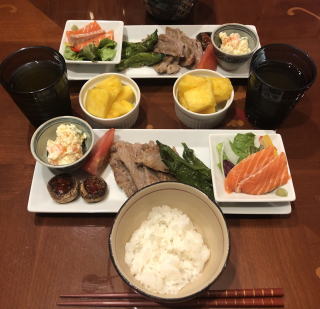 我が家ではプレートの上に幾つかの料理を少しずつ並べたものを「定食」と呼んでいまして、僕が嫁さんに「今日の夜は定食!」と告げた日の食事は下記の写真のような感じです。定食の日は、わざわざ定食を作る為に買出しをするのではなく、前日の料理の余り物を再加工したり、冷蔵庫の中の残り物や買ったけど使ってないままになっている保存食材など利用。料理をした際に余る野菜や肉の切れ端なんかも捨てずに残しておき、こういう時に役立てます。野菜はキュウリやモヤシなど足の早いもの以外は冷蔵庫に入れておけば、使い残しでも結構長持ちしますよ。こういうことを言うと駄目なのかも知れませんが、我が家では賞味期限なんて過ぎていても、腐ってでもしない限りはバンバン料理に使います(もったいないし、お金に余裕も無いので・笑)。