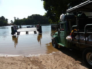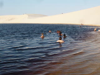 写真左はバヘリーニャスの街。ここの郊外にあるのが、雨季には大小の湖が砂丘の中に出現する幻想的な風景で有名なレンソイス(写真右)。レンソイスへは写真中央の4WDトラックの荷台を座席に改造した車で向かいますが、途中から道路は未舗装となり、恐ろしいくらいに車体が上下に揺れました(汗)。lençóisはポルトガル語でシーツの複数形。まさしく、シーツを折り重ねたような真っ白な砂丘が続いています。砂丘の中の小さな湖は雨季の限られた期間にしか出現しませんので、それを見たければ訪問時期には注意してください(大きい湖は一年中、水が枯れることなく砂丘内にあります)。