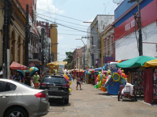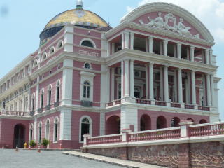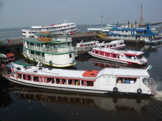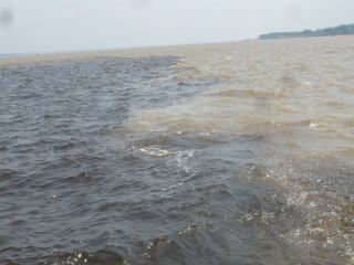 ボア・ビスタから夜行バスに乗ってマナウスに到着。人口2百万人、アマゾン地域で最大の街です。アマゾン川の河口から千五百キロも上流というこんな辺鄙な地で街が発展したのは、かつてはゴムのプランテーションが盛んで莫大な富を生み出していたから。中央の立派な建物はその頃に建てられた劇場で、往時の勢いを思い知らされます。マナウスはアマゾン川と支流のネグロ川が合流する地点で、アマゾン川クルーズに乗船すると、川の色がきれいに二色に分かれているのを見ることができ、写真右はその様子。左側の黒い水がネグロ川の水です。マナウスはアマゾン川のかなり上流に位置するのにこの川幅ですよ!如何に大河であるのかが分かりますね。大型の貨物船でも十分にここまでやって来れます。