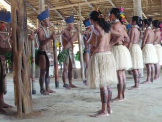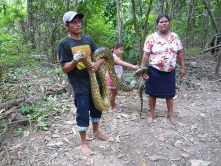 マナウス近辺では、アマゾン川クルーズの観光船が頻繁に行き交っています。中央の写真は一日クルーズツアーで立ち寄った少数民族の村(完全に観光客向けですが)。ここの村の人はコロンビアの内戦中にコロンビアから逃げてきた避難民だそうで、確かにスペイン語で話をしていました。右はアマゾンのジャングルでお約束の大蛇、アナコンダ(笑)。アナコンダは本来、水中に生息している爬虫類なんですよ。