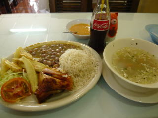 グアヤキルです。首都のキトよりもはるかにデカい大都市で、エクアドルで一番治安の悪い街とされています。僕がこの街を訪れる数カ月前に、新婚旅行でグアヤキルを訪れていた日本人夫婦が強盗に襲われ、旦那さんが射殺されるという事件が起こっていたので、とてもブルーな気分でした。右端はエクアドルの食事。エクアドルは独自通貨を発行しておらず、すべての決済は米ドル。ですが、物価は安くて3ドルも出せば定食を食べることができました(当時は1ドル=100円時代)。