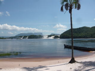 エンジェル・フォールは川岸から離れた所にあるので、船の到着場所に写真左端のようなトタン屋根のベース・キャンプが設置されてます(ツアー会社によって場所は異なります)。夜はここでハンモックを吊るして1泊。トイレは水洗トイレがちゃんとありますしシャワーも浴びることが可能で、蚊などの不快な害虫もほとんどいませんでした。夜の食事は船の船頭さんが焚火の炎でロースト・チキンを焼いてくれ、とても美味しかったです。ベース・キャンプからエンジェル・フォールへは、ジャングルの中をトレッキングしながら約1時間。突然、視界が開けて滝が現れます。高さ約千メートルのギアナ高地の垂直の崖の頂上から流れ落ちる水はその高さ故に途中で水蒸気になってしまい、地上に落ちることはありません。「ほーぅ、これがエンジェル・フォールか!」という感じでした(笑)。因みにエンジェル・フォールのエンジェルは、この滝を発見した人の名前。右から2枚目の写真はサンタ・エレーナ・デ・ウアレインの街。ここまで来れば、ブラジルはもう目前です。